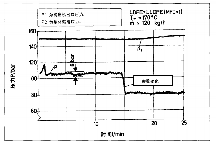 如果在機(jī)頭的后部安裝了熔體泵,則可以通過齒間連續(xù)的嚙合以及??茢D出熔體泵采用的漸開型斜因技術(shù),增加齒的嚙合度,從而對物料進(jìn)行持續(xù)平穩(wěn)的擠壓以消除壓力波動。如圖1所示,P1為熔體在機(jī)頭的壓力,波動較大; P2為安裝泵后的出口壓力,幾乎沒有波動。